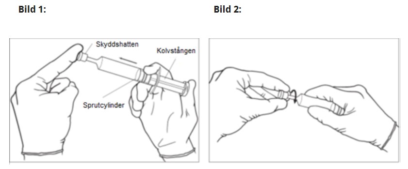 Före det att skyddshatten tas av ska kolvstången tryckas in för att få bort eventuellt motstånd, på så sätt kan sprutan tömmas lätt och jämnt (bild 1).